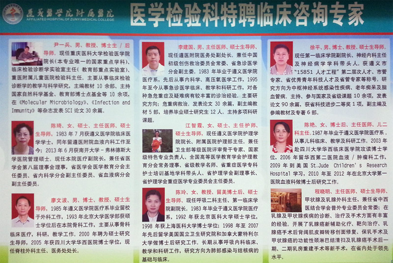 3044永利集团集团附属医院医学检验科地址:贵州省遵义市大连路149号 电话:(0851)28608182 邮编:563003