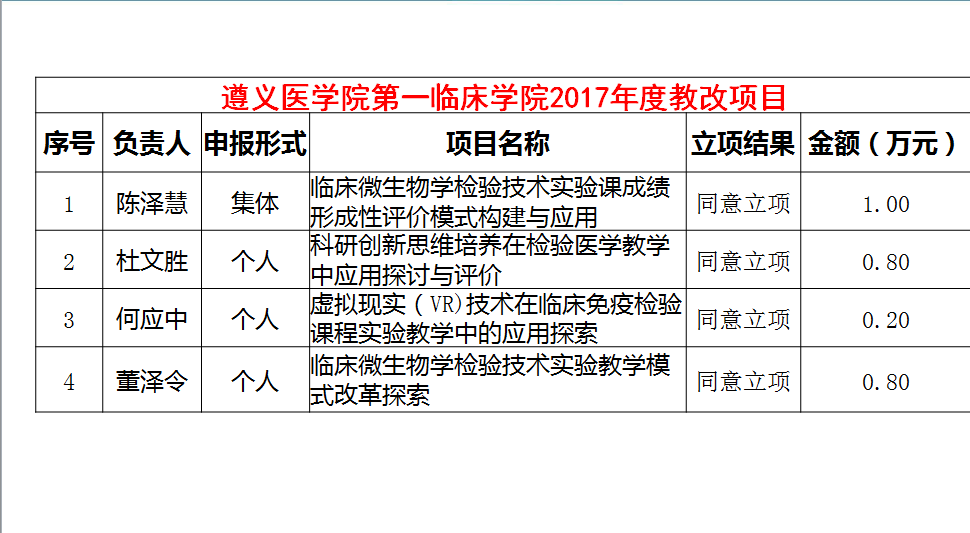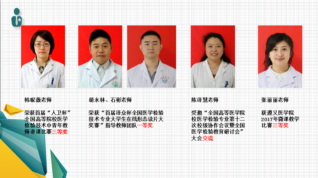 其他成果方面,“专业综合改革试点”项目(在研)、TNS模式建立及其在医学检验实习生能力培养中的应用探索(在研)”分获遵义医公司医学2017本科教学工作表彰;获得2017年度遵义医公司、遵义医公司医学与科技公司“老员工创新创业训练计划”资助项目2项、另外,教研室闵迅博士、陈泽慧教授、张丽丽博士先后受邀外出讲学10余次。