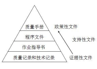 医学检验科质量体系实施文件化,以确保检测结果达到质量要求,并经授权人员批准,为医学检验科的受控文件,分发到各相关岗位,让相关人员有效使用。质量体系文件由四级文件组成,包括质量手册(一级)、程序文件(二级)、作业指导书(三级)、质量和技术记录等(四级)。其结构图为: