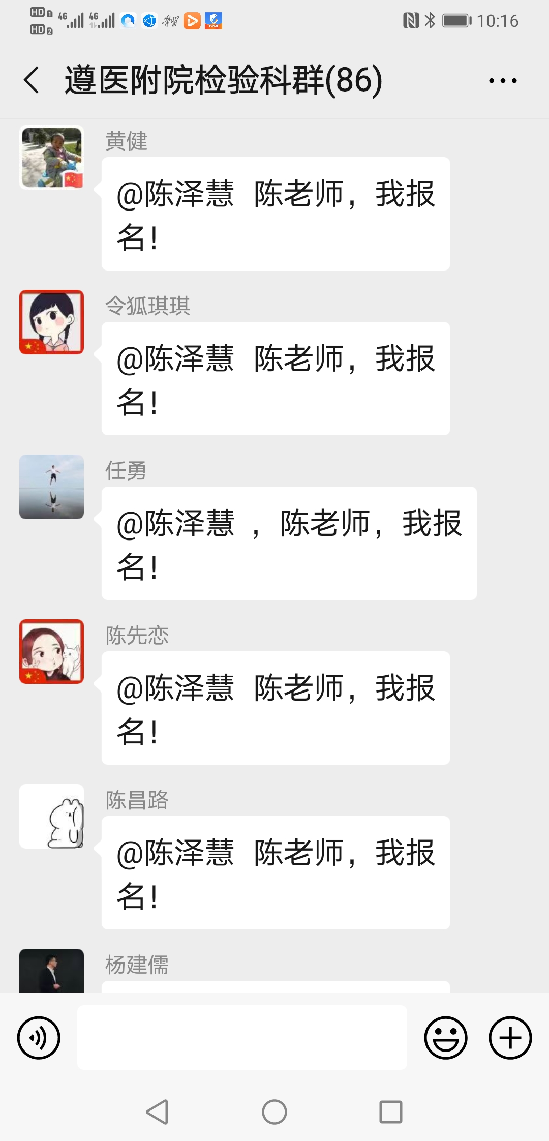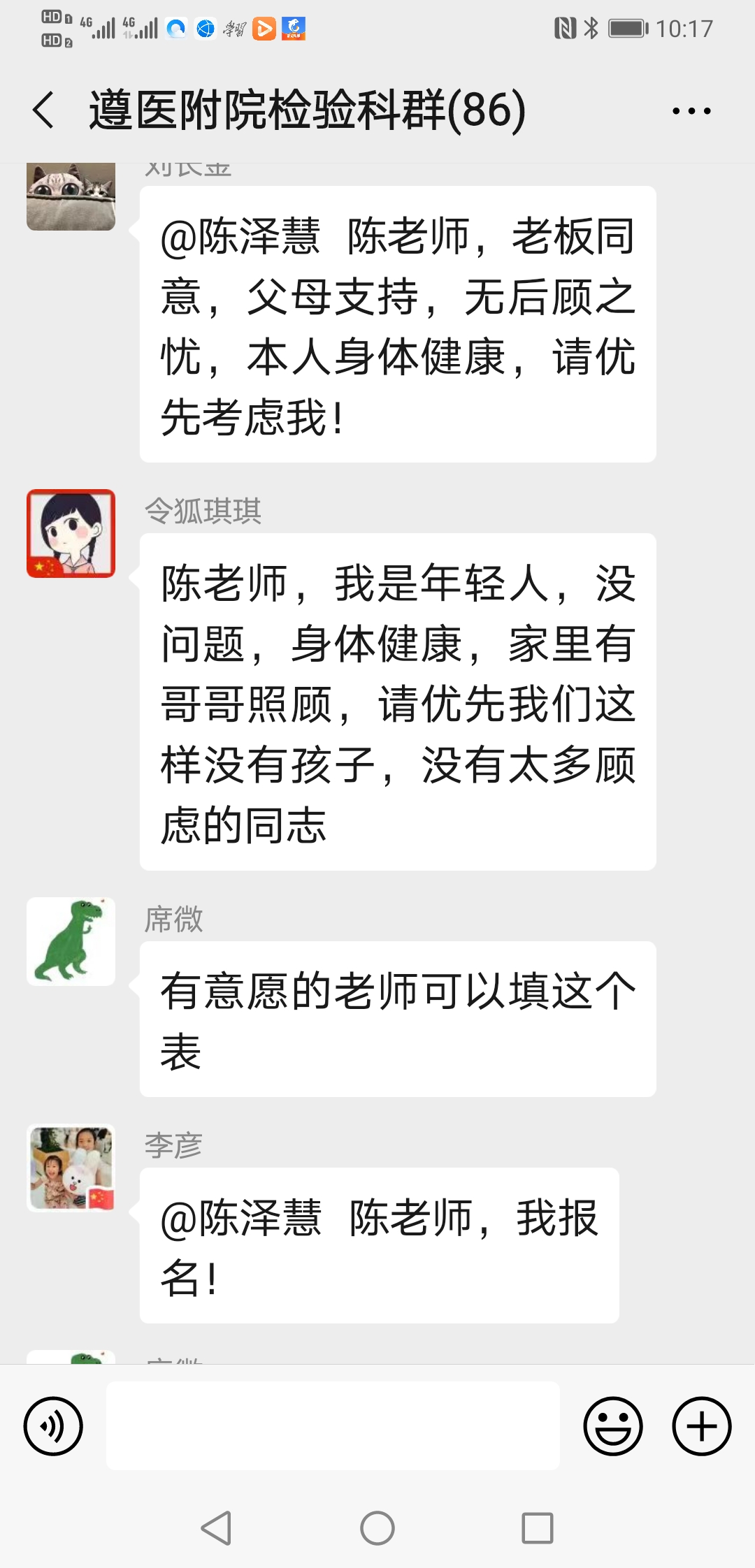 ……@陈泽慧 陈老师 我家还有兄弟姐妹照顾,我现在也没成家,也没娃娃,也没有后顾之忧,也是男生,且身强力壮,轮转过发光、生化和整个临检,况且临床大部分内科我都轮转学习过;也是新党员,国家有难,匹夫有责,希望领导们考虑我去吧!