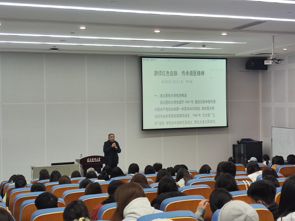 田宗远教授以《深入学习党的二十届三中全会精神》为题,回顾融通了大量党史知识,阐述了进一步全面深化改革的重要性和必要性、目标、原则以及具体部署,并对如何贯彻落实党的二十届三中全会精神进行了深入讲解。罗开源老师以《赓续红色血脉传承遵医精神》为题,从八个阶段分别介绍了红色遵医的历史、发展成就等。罗老师还动情讲述了以烈士身份被追授的“两弹元勋”科学家郭永怀的感人故事。