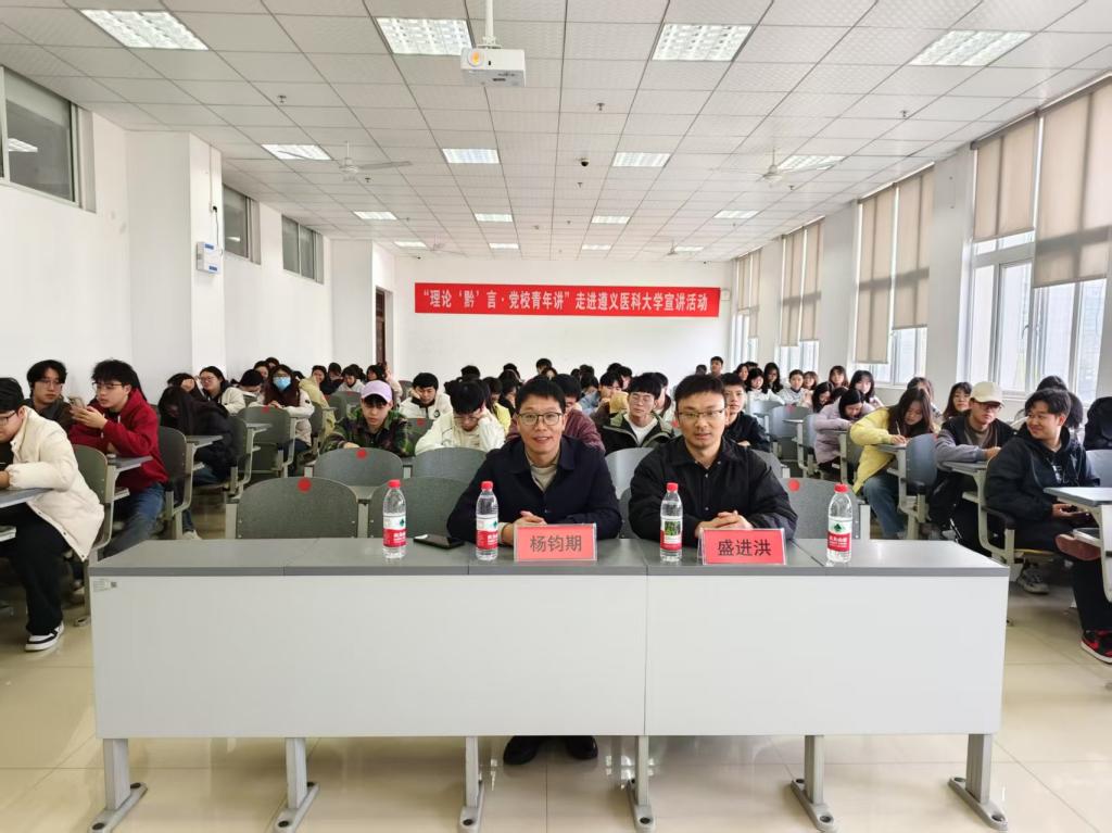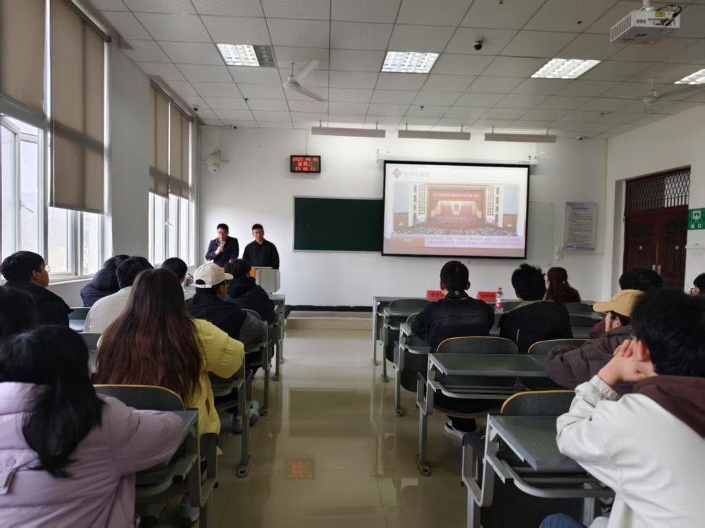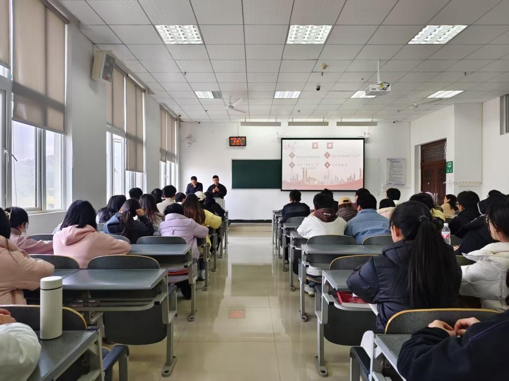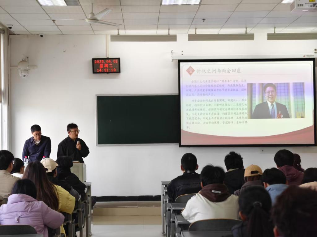 为深入学习贯彻习近平新时代中国特色社会主义思想,扎实推进党的创新理论"三进"工作,2025年4月1日,中共贵州省委党校讲师团成员、贵州师范大学马克思主义公司教授杨钧期、盛进洪同志赴永利3044集团官网,联合开展“理论‘黔言’·党校青年讲”(理论宣传二人讲)专题宣讲活动。活动以“打破内卷困局,重塑竞争新生态”为题宣讲2025年全国两会精神。公司党委书记周光润、副书记罗治宇、全体专职辅导员和22级员工共150余人参加活动。