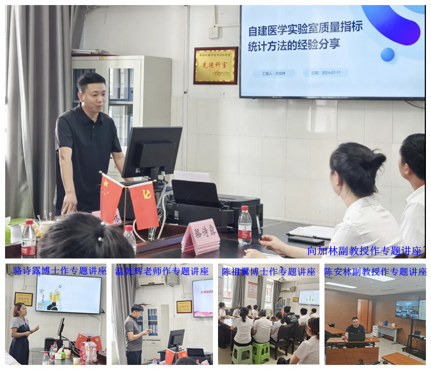会后,专家组兵分两路,分赴上述医院检验实验室进行参观交流和现场指导。专题讲座环节,专家组一行共开展了4场次18人次的专题讲座,覆盖各区县检验人员300余人。其中杨艳围绕《医学实验室ISO15189认可经验分享》、曹喻围绕《细胞形态识别要点与案例分享》、陈先恋围绕《真菌实验室能力建设及形态初相识》、袁瑾围绕《定量项目室内质控策略及程序(Westgard多规则结合6σ评估方案》展开讲授;向加林就《自建医学实验室质量指标统计方法的经验分享》、陈祖翼就《MP-SAT分子诊断新技术及临床应用进展》、陈安林就《临床微生物室内质量控制经验分享》、骆诗露就《临床定量项目室内质量控制经验分享》、温乾辉就《外周血细胞形态识别要点与案例分享》等专题讲座。