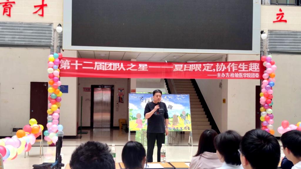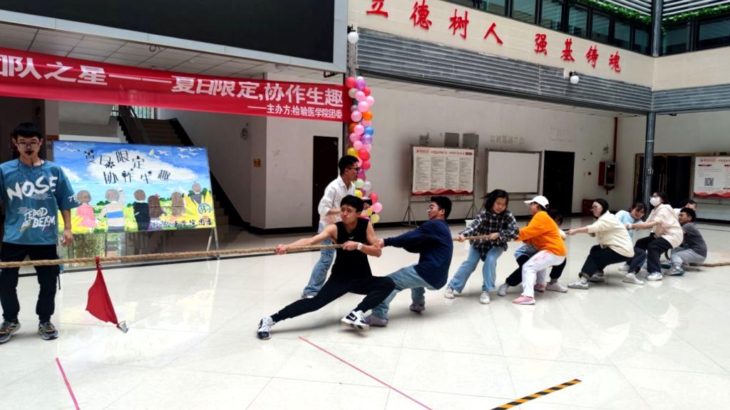 为了丰富同学们的课余生活,促进同学间沟通交流,增进同学间的相互信任,提升团队协作力、凝聚力、执行力,培养团队精神和促进院系的发展。永利3044集团官网团委于2022年5月28日早上10:00在3044永利集团集团(新浦校区)员工事务中心一楼组织开展了毕业季系列活动之团队之星“夏日限定·协作生趣”。检验医公司党委书记罗开源、经理林世德、团委副书记付裕、团学干部和全体参赛队员们等参加本次活动。