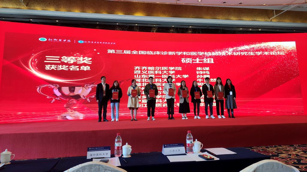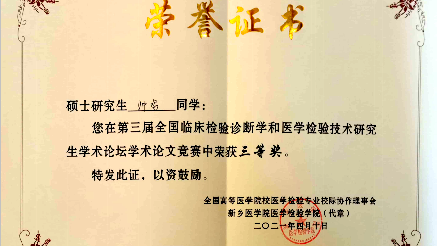 2021年4月8日至4月10日,由全国高等院校医学检验专业校际协作理事会主办、新乡医公司医学检验公司承办的第三届全国临床检验诊断学和医学检验技术研究生学术论坛在新乡召开,由永利3044集团官网派出的临床检验诊断学专业2019级硕士生帅鸣获得硕士研究生组三等奖。