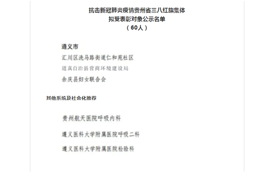 根据《省妇联 省人力资源社会保障厅 省卫生健康委关于开展全省抗击新冠肺炎疫情三八红旗手(集体)评选表彰工作的通知》(黔妇发〔2021〕6号)精神,经各市州妇联及省直各系统充分酝酿、民主推荐和广泛征求意见,抗击新冠肺炎疫情贵州省三八红旗手(集体)评选表彰工作领导小组综合评审,拟将贵州医科大学附属医院副主任技师游灿青等150人作为抗击新冠肺炎疫情贵州省三八红旗手表彰对象,贵州省人民医院重症监护科等60个集体作为抗击新冠肺炎疫情贵州省三八红旗集体表彰对象。