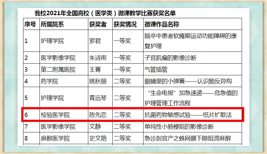 热烈祝贺永利3044集团官网陈先恋老师作品《抗菌药物敏感试验——纸片扩散法》在此次参赛中荣获二等奖!