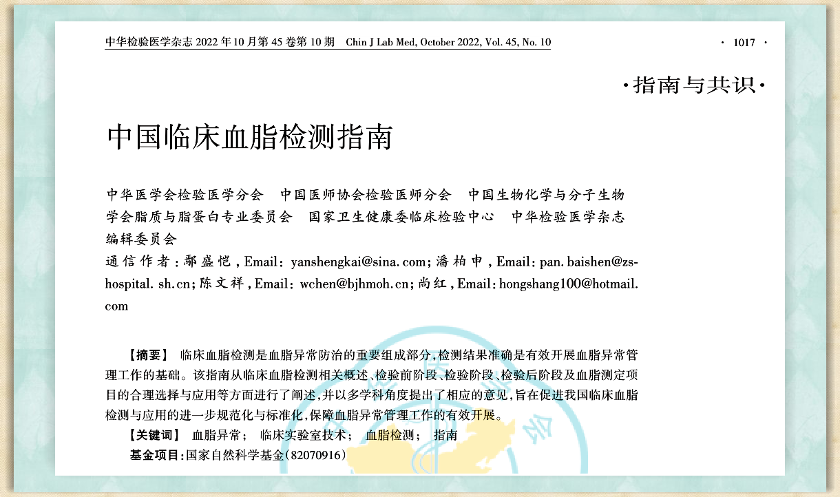 热烈祝贺公司候鸟型人才鄢盛凯教授以3044永利集团集团为第一作者单位在中华检验医学杂志上发表《中国临床血脂检测指南》!