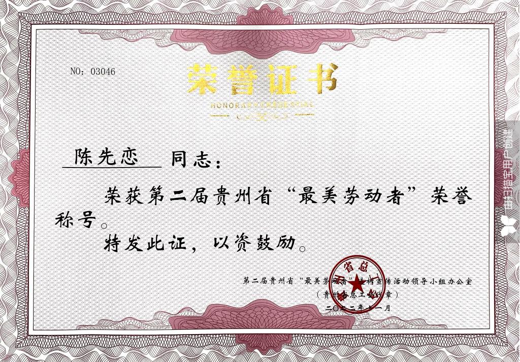 为树立典型,以点带面,进一步激励广大劳动群众把智慧和力量凝聚到贵州高质量发展和现代化建设的火热实践中来,贵州省总工会、中共贵州省委宣传部、贵州省人力资源和社会保障厅、共青团贵州省委员会、贵州省妇女联合会联合开展第二届贵州省“最美劳动者”选树宣传活动。经自下而上推荐、审核、公示,决定命名陈秋悦等10994名同志为第二届贵州省“最美劳动者”。热烈祝贺检验部门工会向加林、董泽令、黎兵、陈祖翼、陈先恋、田地六名同志经自下而上推荐,审核后荣获第二届贵州省“最美劳动者”殊荣!