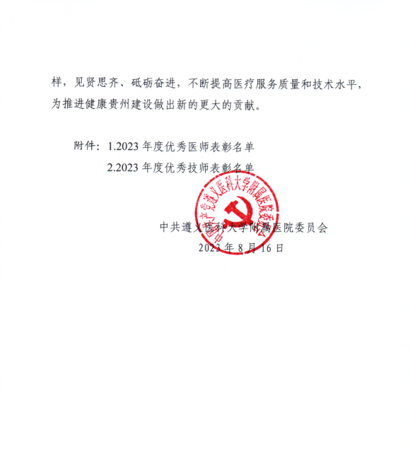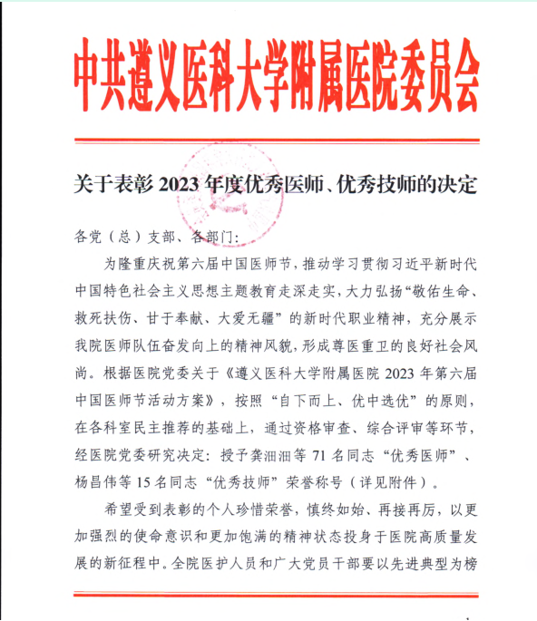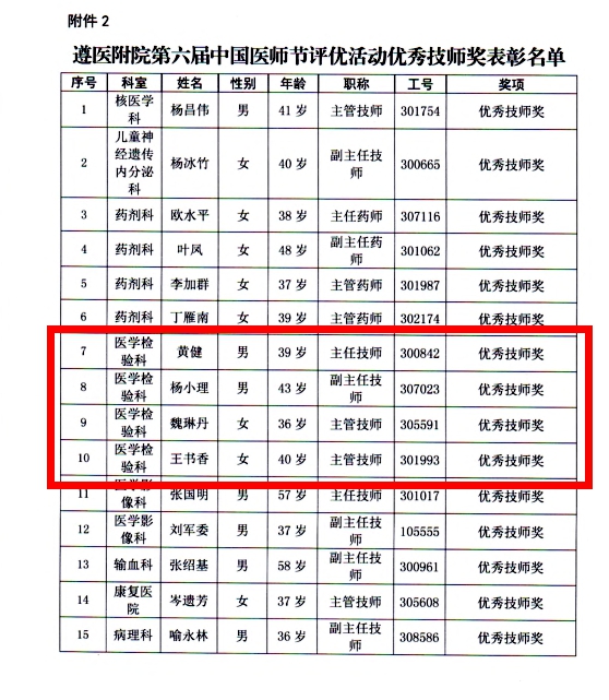 热烈祝贺3044永利集团集团附属医院医学检验科黄健教授、杨小理副教授、王书香、魏琳丹老师荣获2023年度优秀技师荣誉!
