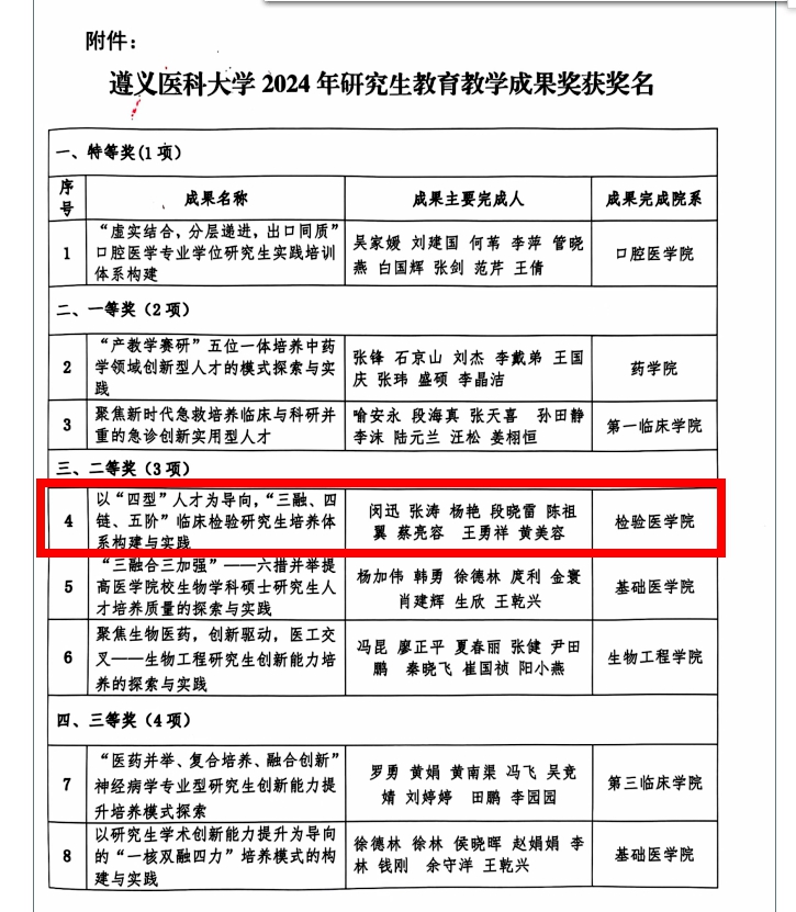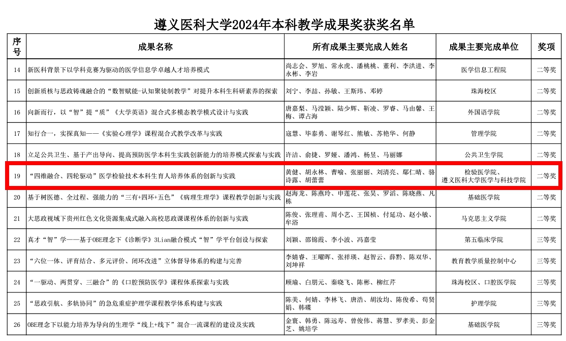 热烈祝贺公司黄健教授团队以《“四维融合、四轮驱动”医学检验技术本科生育人培养体系的创新与实践》为题申报成果荣获“二等奖”。