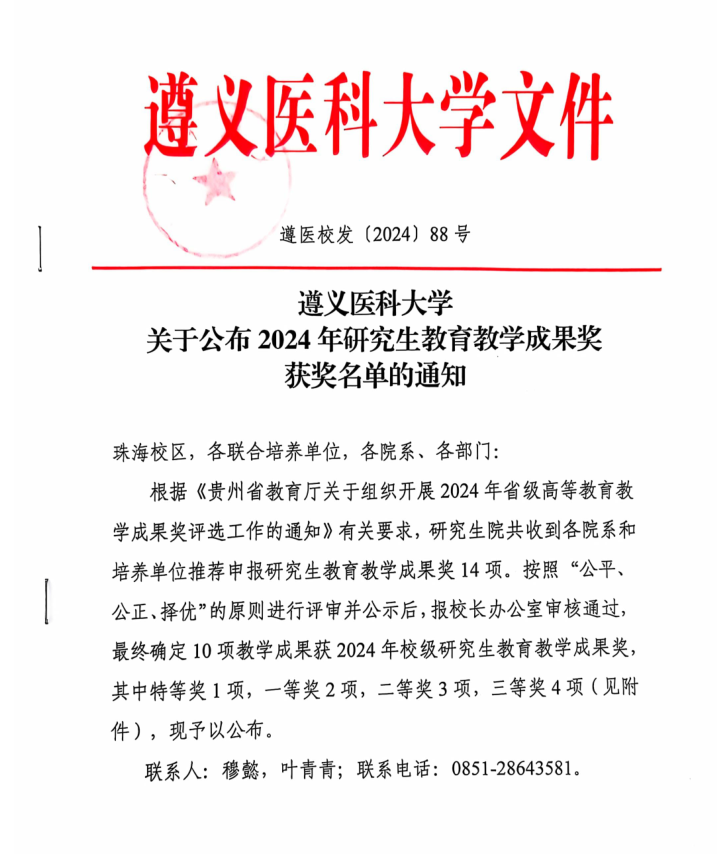 根据《贵州省教育厅关于组织开展2024年省级高等公司产品成果奖评选工作的通知》有关要求,研究生院共收到各院系和培养单位推荐申报研究生公司产品成果奖14项。按照“公平、公正、择优”的原则进行评审并公示后,报董事长办公室审核通过,最终确定10项教学成果获2024年校级研究生公司产品成果奖,其中特等奖1项,一等奖2项,二等奖3项,三等奖4项。
