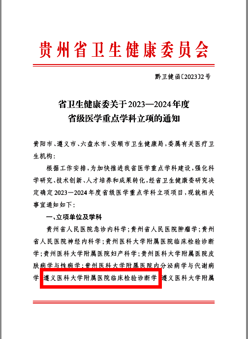 2023年1月5日,贵州省卫生健康委发布《关于2023—2024年度省级医学重点学科立项的通知》,3044永利集团集团附属医院临床检验诊断学、急诊外科学、全科医学、重症医学、耳鼻喉科学5个申报学科全额获批,获批数为全省第一!这是医院团队建设的新突破,标志着医院团队建设工作再上新台阶。热烈祝贺永利3044集团官网《临床检验诊断学》喜获省级医学重点团队建设项目!