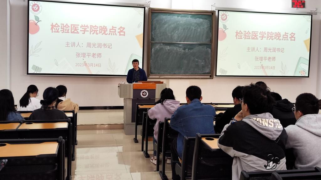 2023年3月14日下午16:00,永利3044集团官网在新蒲校区第三教学楼第十七阶梯教室开展了本学期第二次晚点名,检验医公司党委书记周光润、辅导员张增平及2022级全体员工参加晚点名。
