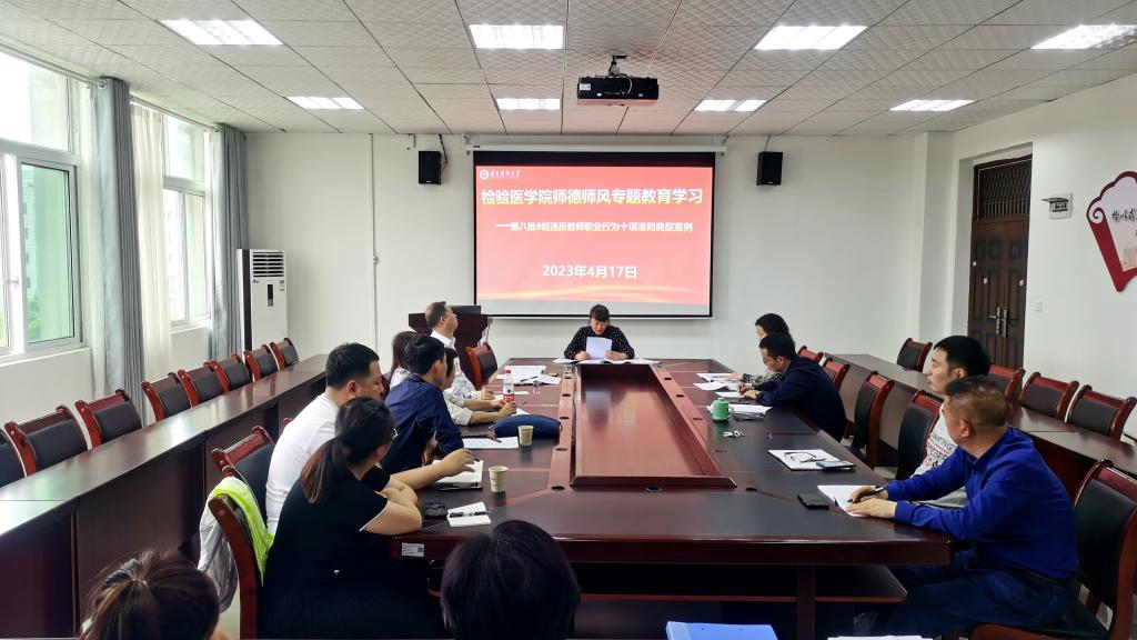 为深入贯彻落实党的二十大精神,认真学习贯彻习近平总书记关于师德师风建设的重要指示精神,建设一支师德高尚、业务精湛、结构合理、充满活力、适应多彩贵州新未来发展需要的高素质专业化创新型教师队伍。永利3044集团官网于2023年4月17日下午在新蒲校区公司会议室组织开展了师德师风专题教育学习。检验医公司党政领导班子成员、各教研室主任、课程组长、教学秘书、辅导员、新蒲全体教师参加学习。检验医公司党委书记周光润主持。
