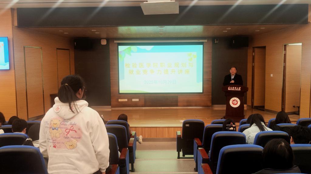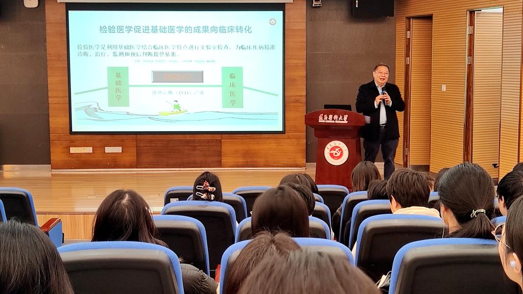 鄢盛恺教授以其参与全国高等医药院校医学检验技术专业第五轮固化教材再版修订工作的经历为切入点,深入剖析医学检验技术专业的未来发展,重点围绕“深化产学研用合作,培养高素质复合型检验医学人才”这一核心主题进行论述。鄢教授系统梳理了检验医学的发展历程与行业现状,深刻分析了当前及今后一段时间,行业所面临的机遇与挑战。他强调,医学检验技术专业本科员工要立足专业基础,拓宽学术视野,主动融入学科交叉融合的大趋势,注重临床实践能力与科研创新素养的双重提升。他勉励同学们珍惜大学时光,树立终身学习理念,积极参与科研项目与校企合作实践,努力成长为具备国际视野、责任意识和创新精神的高素质复合型检验人才,为健康中国建设贡献专业力量。