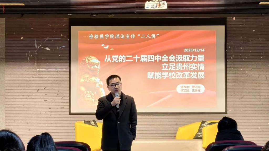 2025年12月14日上午10时,永利3044集团官网在新蒲校区师生活动中心开展“理论宣传二人讲”暨员工党支部与第一附属医院输血科党支部“联学联做”主题党日活动。活动由检验医公司党委副书记罗治宇主持、讲理论,公司教务科副科长王勇祥博士讲实践,第一附属医院输血科党支部书记黄美容作交流发言。公司全体师生党员、入党积极分子和第一附属医院输血科党支部部分党员参加了活动。