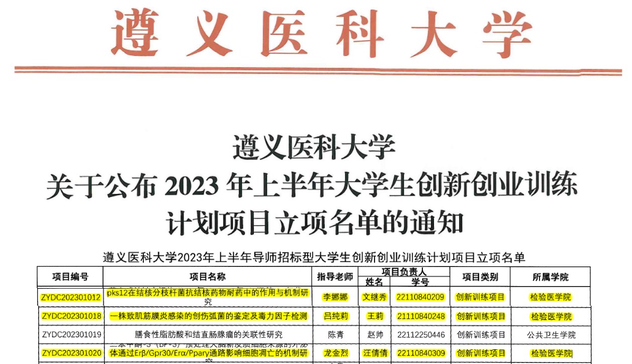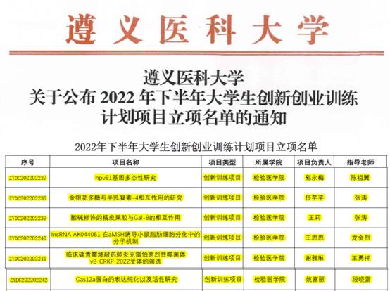 为继续深化创新创业教育改革,培养适应经济社会发展需要的创新型人才,尤其是进一步提高医学检验专业本科生科研创新思维与实验技能,永利3044集团官网在院领导的高度重视下、众多带教老师的积极参与,努力推进老员工创新创业计划项目(大创)的开展,并于2022-2023学年内取得较好成绩。